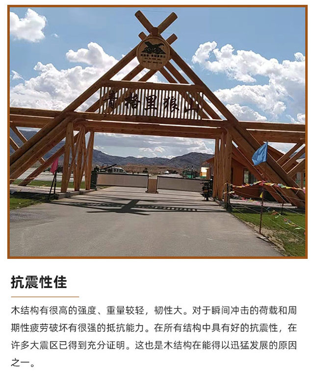 • 木結(jié)構(gòu)有很高的強(qiáng)度、重量較輕,韌性大。對于瞬間沖擊的荷載和周 期性疲勞破壞有很強(qiáng)的抵抗能力。在所有結(jié)構(gòu)中具有好的抗震性,在 許多大震區(qū)已得到充分證明。這也是木結(jié)構(gòu)在能得以迅猛發(fā)展的原因 之一。